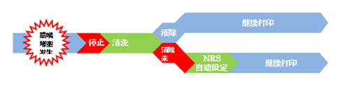 传感器自动检测喷嘴状态。检测到喷嘴断线时,自动执行清洗作业,排除喷嘴断线故障。(图7)可为每个打印数据设置定时检查喷嘴的状态,以小时为单位设定。防止连续输出时,发生喷嘴堵塞后,导致所有输出物浪费。 为保持生产率的喷嘴断线补偿功能“NRS(Nozzle Recovery System)” 以往,对于即使清洗喷嘴,也无法改善的喷嘴故障,需服务人员维修,维修结束前须停止打印机运转。“NRS”实现连续作业,换而言之,当“NCU”发现问题时,即使清洗依然没有改善的喷嘴断线故障可用其他喷嘴替代打印。无需等待服务人员前来维修就可以恢复作业。(※6) ※6:根据打印方式存在不可使用NRS的情况。