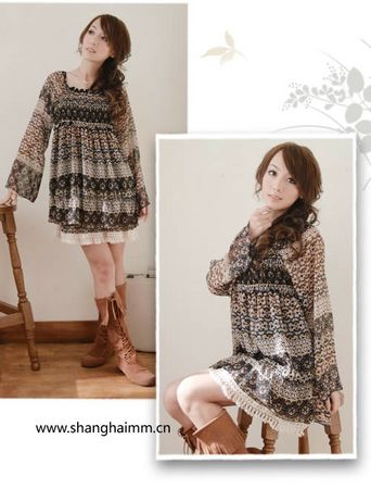 今年最夯的波西米亚风甜美印花雪纺洋装在冬季依然热卖,采用了轻柔的雪纺材质,饱满的颜色图案,内里下摆为流苏设计,呈现出异国时尚层次感;伸缩领口+胸围,自由变换一字领、圆领,还有up up的视觉效果哦!稍宽的袖型更显浪漫的异国情调;外面穿搭厚大衣或军装外套,雪纺洋装与长大衣的混搭组合,再加上长靴后,时尚感逼人,是今季日本女孩的最IN装扮!