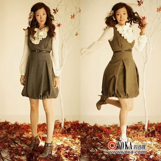 搭配指南:厚重的呢子连衣裙搭配衬衫最完美,选择领部和袖口比较夸张设计的衬衫,更加展现复古的一面。