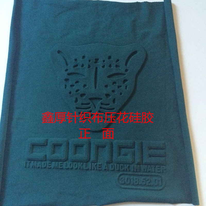 按A :B=10:1重量比例混合均匀,混合好的胶料操作时间长达5-8小时。首先硅胶用网版(80目)印刷在针织布面料反面,压花模具是双面模,压花模具中间有一点点的空间;然后把针织布放在压花模上,需要压花的地方盖上胶水,胶的厚度视客户需求而定,用高温压花机一压即可。这样压出来的面料,永远的保持花纹立体感不变型,高温水洗不脱落。