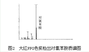 按上述1·2方法将样品处理后,按1·3规定的色谱条件,对其大红FFG涂料印花色浆样分析,通过对其被检出组分的质谱解析,该样品中检出对氯苯胺如图2,定量测定含量545mg/kg,被检物中检出量超过染料芳香胺组分含量15Omg/kg的要求。