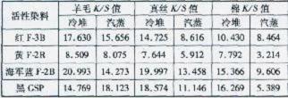 由表3可知,30℃冷堆印花工艺中除活性黄F-2R在羊毛和真丝上的K/S值比传统汽蒸低外,其它均比汽蒸要高。