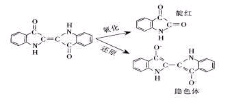 根据靛蓝染料结构和性能,除还原剂外,还可利用氧化剂的化学作用,分裂靛蓝染料结构中共轭双键,达到拔染印花目的。反应如下: