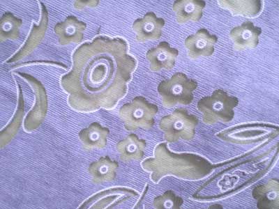 涤/棉混纺布,烂花部位透明度较差,可适用一般烂花产品。