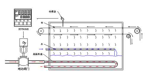 蒸花机电气控制主要有两部分控制组成:第一部分是将染布从设备外引入设备的运动控制部分,主要有台达EH系列PLC和台达变频器以及台达DOP人机组成。第二部分则由台达DTV阀位控制,温度传感器和电动阀门构成的温度控制系统。本文暂时针对对第二部分(图3)展开介绍与探讨。
