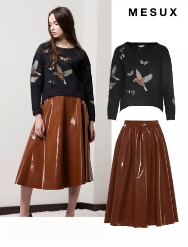 柔韧而富有空间感的涤羊毛,柔软亲肤舒适。棕色和粉色的条纹毛衫拼接于领口和袖口处,配合通身的冷色印花,秉持MESUX一贯的平衡设计理念,使冷暖色的比例平衡协调。搭配极易打理的棕色PU折叠百搭半裙,将时尚与舒适融合,经典与当代融合,形成独一无二的你。