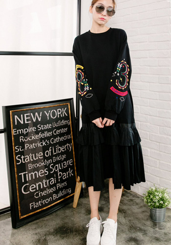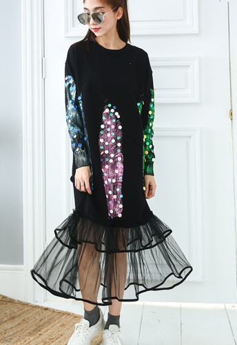 港版暗黑系拼接网纱中长裙,这条裙子的风格稍微黑暗系一点,适合酷酷的拽拽的姑娘,搭配一双黑色的靴子,就会让你有一种桀骜不驯的霸气感觉。纯黑色的设计很酷也很百搭,下摆很飘逸,上身比较宽松不会显肚子,版型也是很好看,而且不容易撞衫。