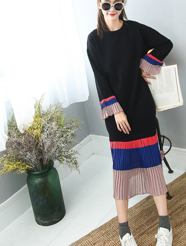 雪纺拼接中长款套头长袖条纹针织连衣裙
