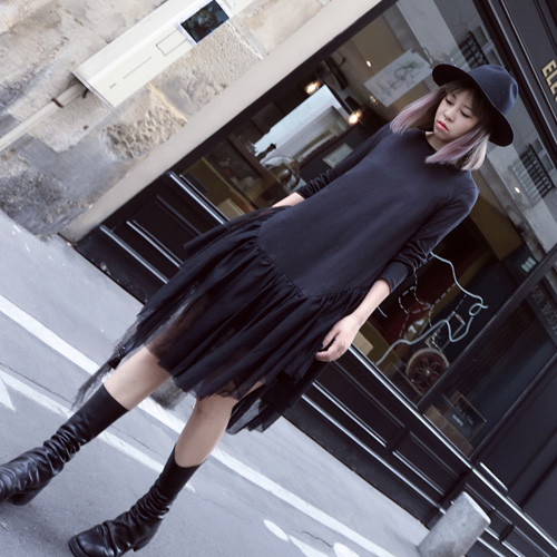 NANA港版暗黑系拼接网纱中长款宽松秋春季内搭显瘦打底连衣裙子