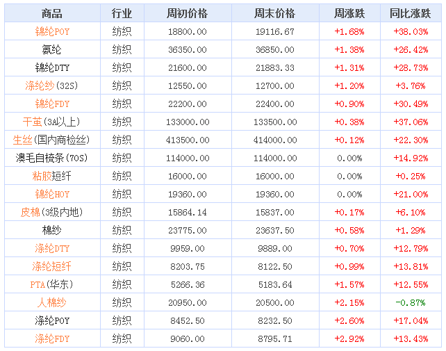 【集萃网观察】据生意社价格监测,2017年第31周(7.31-8.4)大宗商品价格涨跌榜中纺织版块环比上升的商品共7种,涨幅前3的商品分别为锦纶POY(1.68%)、氨纶(1.38%)、锦纶DTY(1.31%)。环比下降的商品共8种,跌幅前3的商品分别为涤纶FDY(-2.92%),涤纶POY(-2.60%),人棉纱(-2.15%)。本周均涨跌幅为-0.26%。