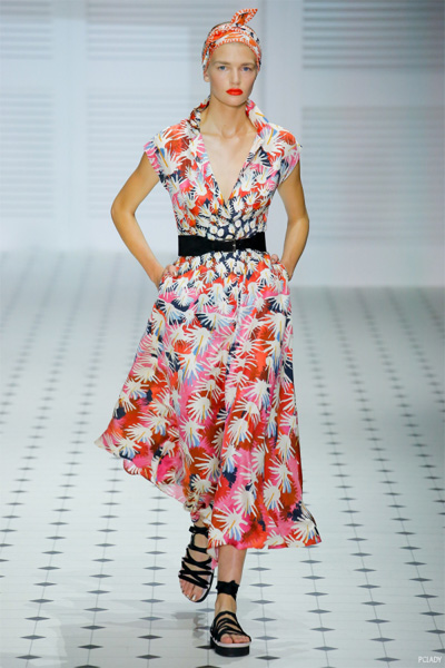 一向爱用蕾丝和刺绣的Temperley London在本次系列中运用大面积印花来呈现一场鸡尾酒礼服派对。充满热带风情的连衣裙在花簇的衬托下透露着浓厚的热带风情,而抽象的线条与暗格纹在一定程度上诠释了波普艺术的美感。