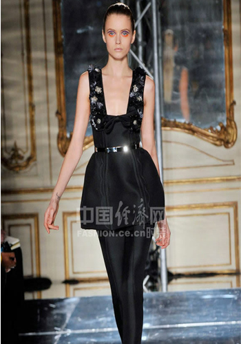关键款式:一系列短的连衣裙———有些有挖领,搭配上束发带;还有高领的穗边无袖包身裙;其他处还有泡泡肩部的外衣裙和贝壳形裙摆的束腰外衣,还有如第二层肌肤般的打节毛衣和小短裙;