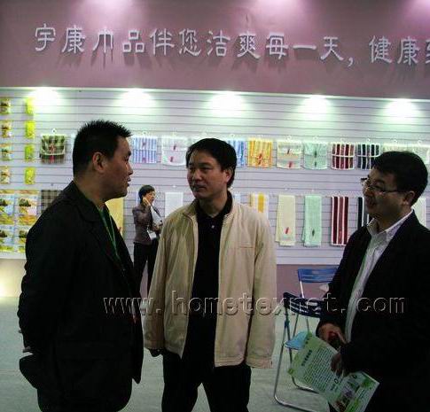 刘总说,这次中针会上带去的新品很受关注,现场就有几十个客户下了订单。当记者问刘总下一届中针会你们还参加吗?刘总爽快地回答,去,肯定要去!这么大的一个潜在客户市场,怎么能丢掉呢。刘总还乐观地告诉记者,竹纤维、竹炭纤维产品之所以走俏,一是因为它的质量的确好,这个已经得到了市场的认可。二是,这个市场是一个新的市场,在价格方面给经销商还有利润空间,所以,这次带来的竹纤维、竹炭纤维销路看好。公司除了竹纤维、竹炭纤维产品外,还有麻纱巾被产品。这种麻纱巾被产品在使用的过程中,不会像纯棉巾被产品在使用久了后会发硬、发粘,麻纱产品非常柔软,这也是宇康的另一个功能性产品。